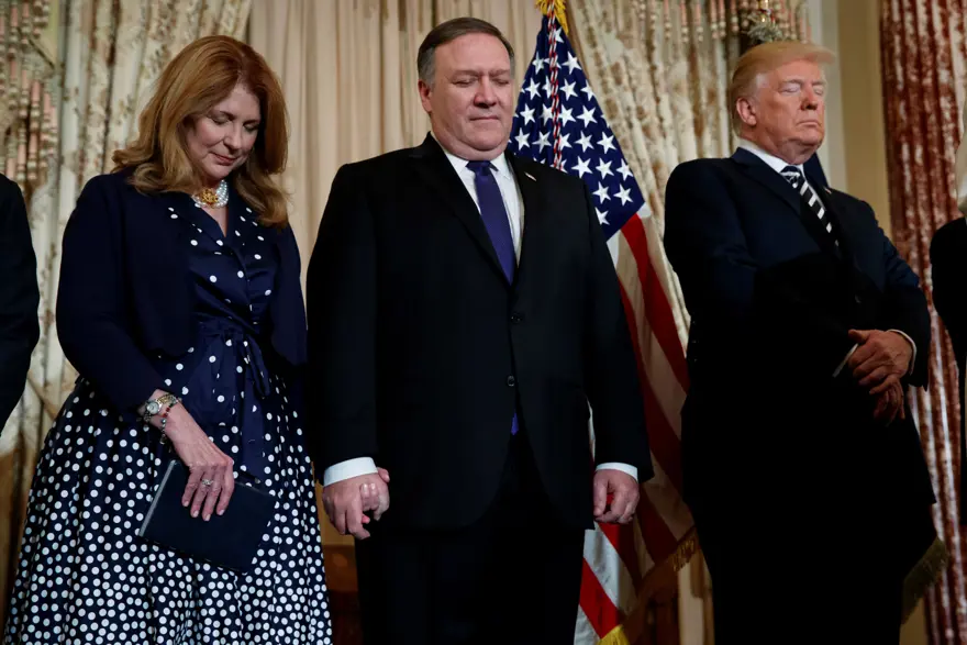 Mike Pompeo için Dışişleri Bakanlığında düzenlenen yemin törenine, ABD Başkanı Donald Trump'ın yanı sıra Başkan Yardımcısı Mike Pence, Pompeo ile ailesi ve bakanlık çalışanları katıldı.