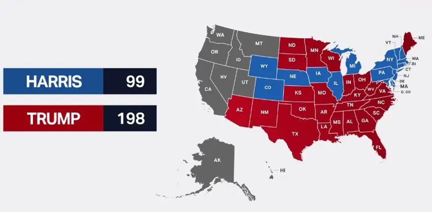 ABD medyası şu ana kadar Trump'ın, ikisi son seçimde Demokratlara oy veren üç önemli savaş alanı Georgia, Kuzey Carolina ve Pensilvanya da dahil olmak üzere 50 ABD eyaletinin yarısından fazlasını kazandığını tahmin ediyor.Böylelikle Trump, başkanlığı kazanmak için gereken 270 oydan 267'sini almış oluyor. Harris'in Seçiciler Kurulu oyu ise 224'te.