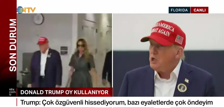 ABD'de Cumhuriyetçilerin adayı Donald Trump, oyunu Florida eyaletinde kullandı. Trump, eşi Melania Trump ile oy verdikten sonra basına açıklama yaptı.Trump, "Çok özgüvenli hissediyorum, bazı eyaletlerde çok öndeyim. Çok iyi gittiğimiz yönünde duyumlar alıyorum. Büyük bir zafer kazanacağımızı düşünüyorum" dedi. Trump gazetecilerden gelen soru üzerine, "Destekçilerime 'Şiddet olmmayacak' dememe gerek yok. Tabii ki şiddet olmayacak. Destekçilerim şiddet yanlısı değil, şiddete inanan insanlar değil. Ben de kesinlikle şiddet istemiyorum" diye konuştu. Trump, "Eğer kaybedersem ve eğer bu dürüst bir seçim olursa, sonucu ilk kabullenen ben olurum" diye ekledi.