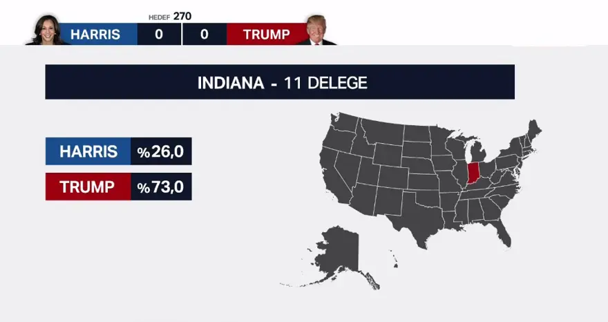 ABD başkanlık seçiminde resmi olmayan sonuçlara göre Cumhuriyetçi Parti’nin adayı Donald Trump, 19 delege, Demokrat Parti’nin adayı Kamala Harris, 3 delege kazandı.Oy oranları: Trump yüzde 54,4, Harris yüzde 44,8.Resmi olmayan sonuçlara göre Indiana ve Kentucky'de Trump, Vermont'ta Harris kazandı.