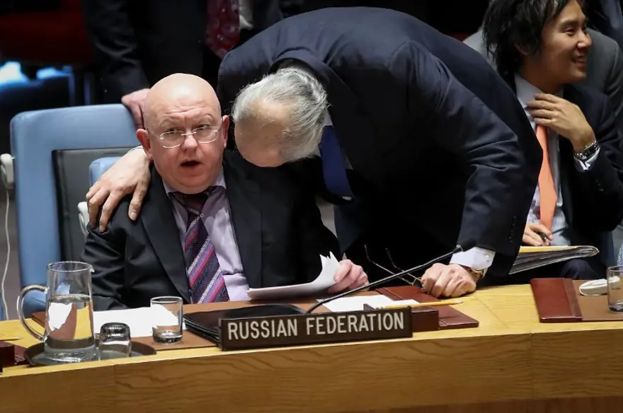 BM Güvenlik Konseyi'ndeki Rusya'nın BM Daimi Temsilcisi Vasili Nebenzia ile Suriye'nin temsilcisi görüşüyor.