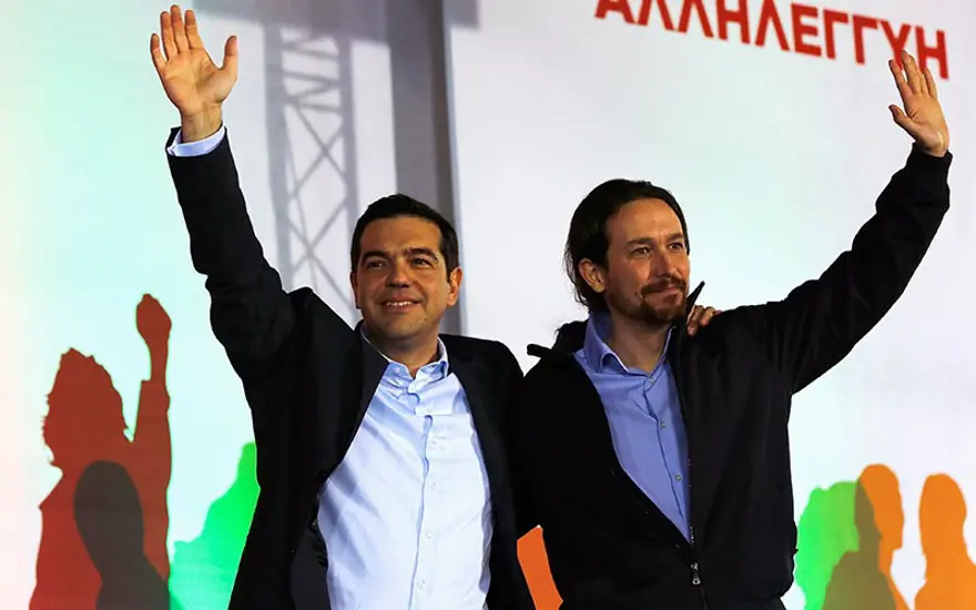 Syriza'nın çizgisinden giden İspanyol parti Podemos'un 36 yaşındaki lideri Pablo Iglesias, Yunanistan Başbakanı Aleksis Çipras ile birlikte
