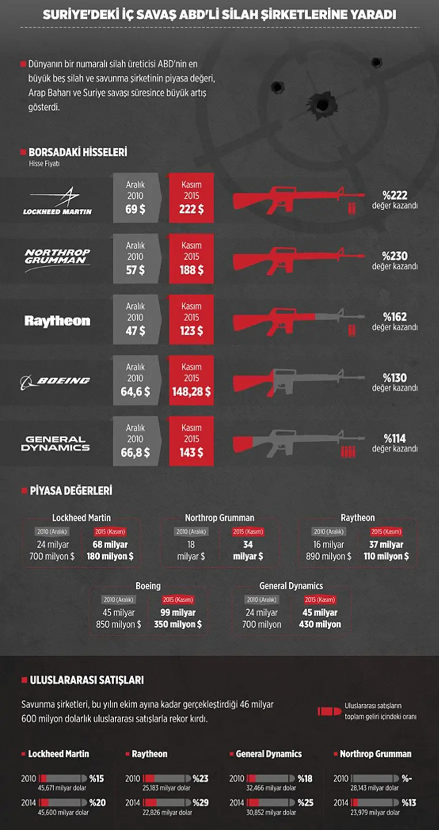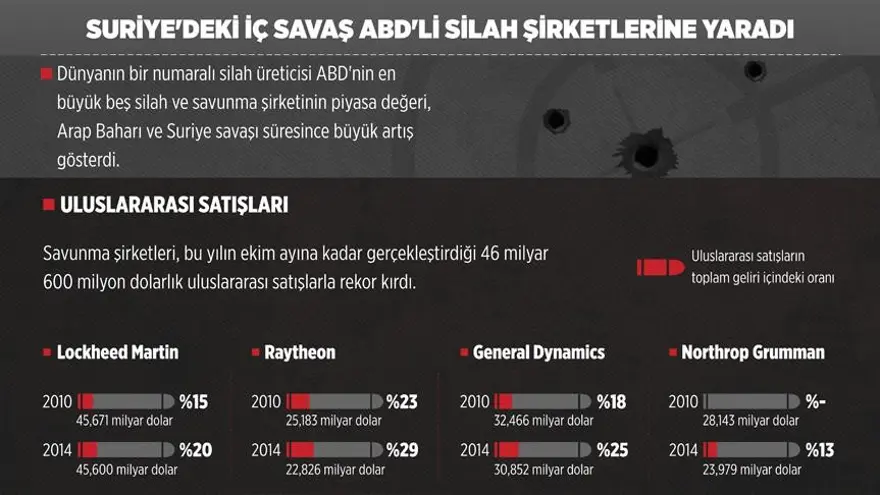 Dünyanın bir numaralı silah üreticisi ABD’nin en büyük beş silah ve savunma şirketinin piyasa değeri, Arap Baharı ve Suriye savaşı süresince büyük artış gösterdi.