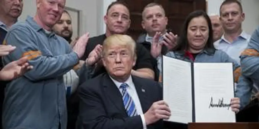 ABD Başkanı Donald Trump, ithal edilen çelik ile alüminyuma ek gümrük vergisi uygulama kararını 8 Mart'ta imzaladıktan sonra basın mensuplarına gösteriyor