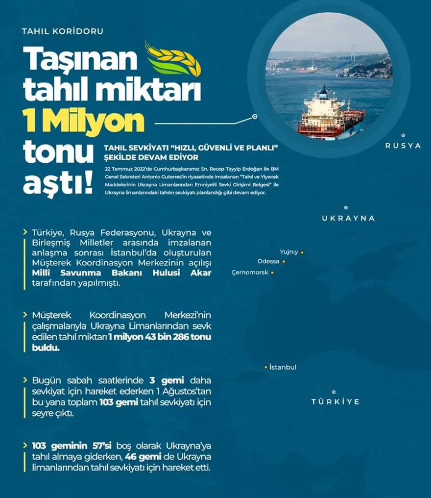 Bakanlıktan yapılan açıklamada, Cumhurbaşkanı Recep Tayyip Erdoğan ile Birleşmiş Milletler (BM) Genel Sekreteri Antonio Guterres'in riyasetinde 22 Temmuz'da imzalanan "Tahıl ve Yiyecek Maddelerinin Ukrayna Limanlarından Emniyetli Sevki Girişimi Belgesi" ile Ukrayna limanlarındaki tahıl sevkiyatının planlandığı gibi devam ettiği belirtildi.