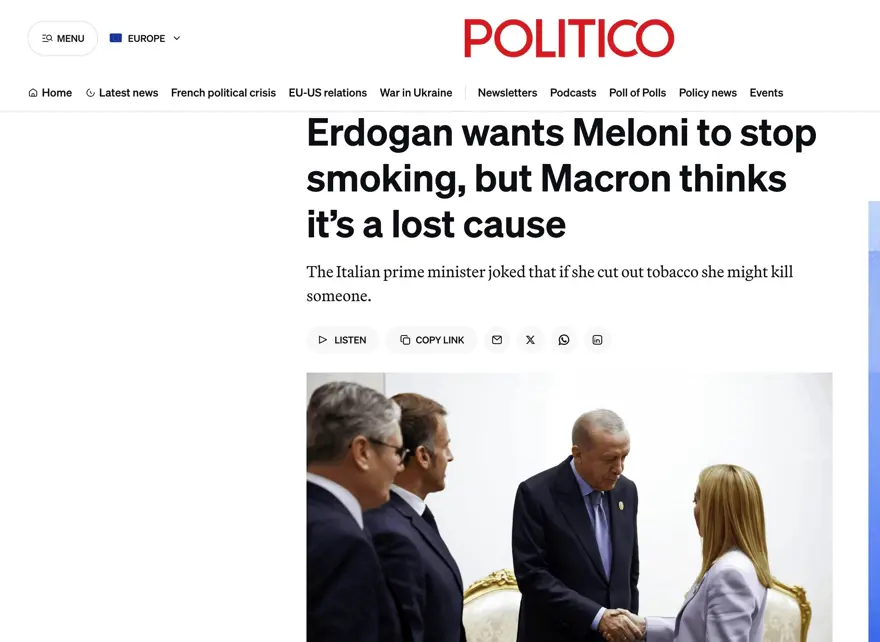 Erdoğan ve Meloni arasındaki diyalog Politico'nun Avrupa baskısında da yer aldı.