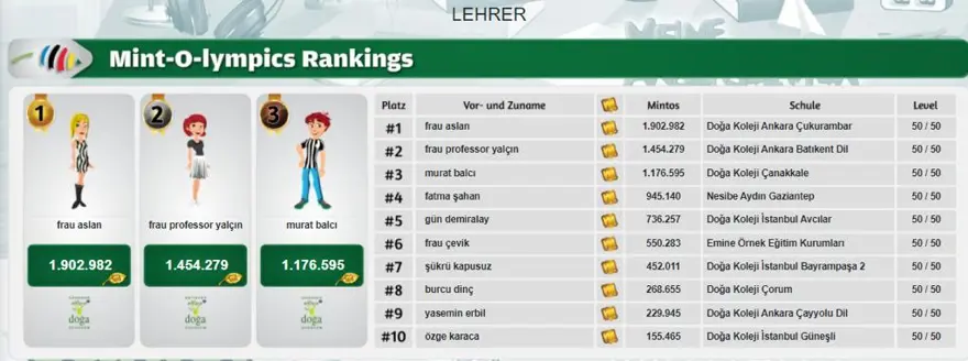 Öğretmenler kategorisinde ilk 3 sırayı İTÜ ETA Vakfı Doğa Koleji öğretmenleri paylaştı. Öğretmenlerin katıldığı “Minticity Lehrer” kategorisinde, İTÜ ETA Vakfı Doğa Koleji Almanca Öğretmenleri Nuray Coşkun Aslan birinci, Burcu Yalçın ikinci, Murat Balcı üçüncü olurken, Şükrü Kapusuz, Gün Demiralay, Burcu Dinç, Yasemin Erbil ve Özge Karaca ilk 10’da yer aldı.