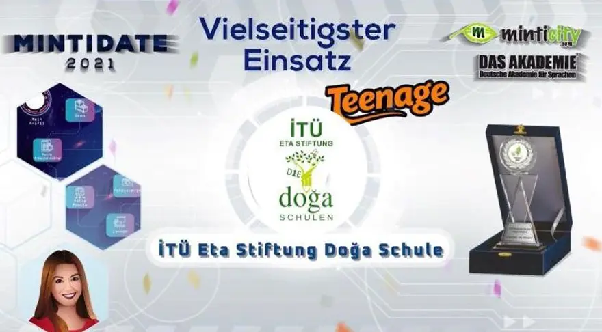 İTÜ ETA Vakfı Doğa Koleji, dünyanın en gelişmiş online Almanca eğitim platformu Minticity’nin, bu platformu kullanan 500 özel okul arasından değerlendirdiği “Minticity Teenage” kategorisinde büyük bir başarıya imza attı. İTÜ ETA Vakfı Doğa Koleji, 500 okul arasından “En Etkin ve Çok Yönlü Kullanan Okul” ödülünün sahibi oldu.
