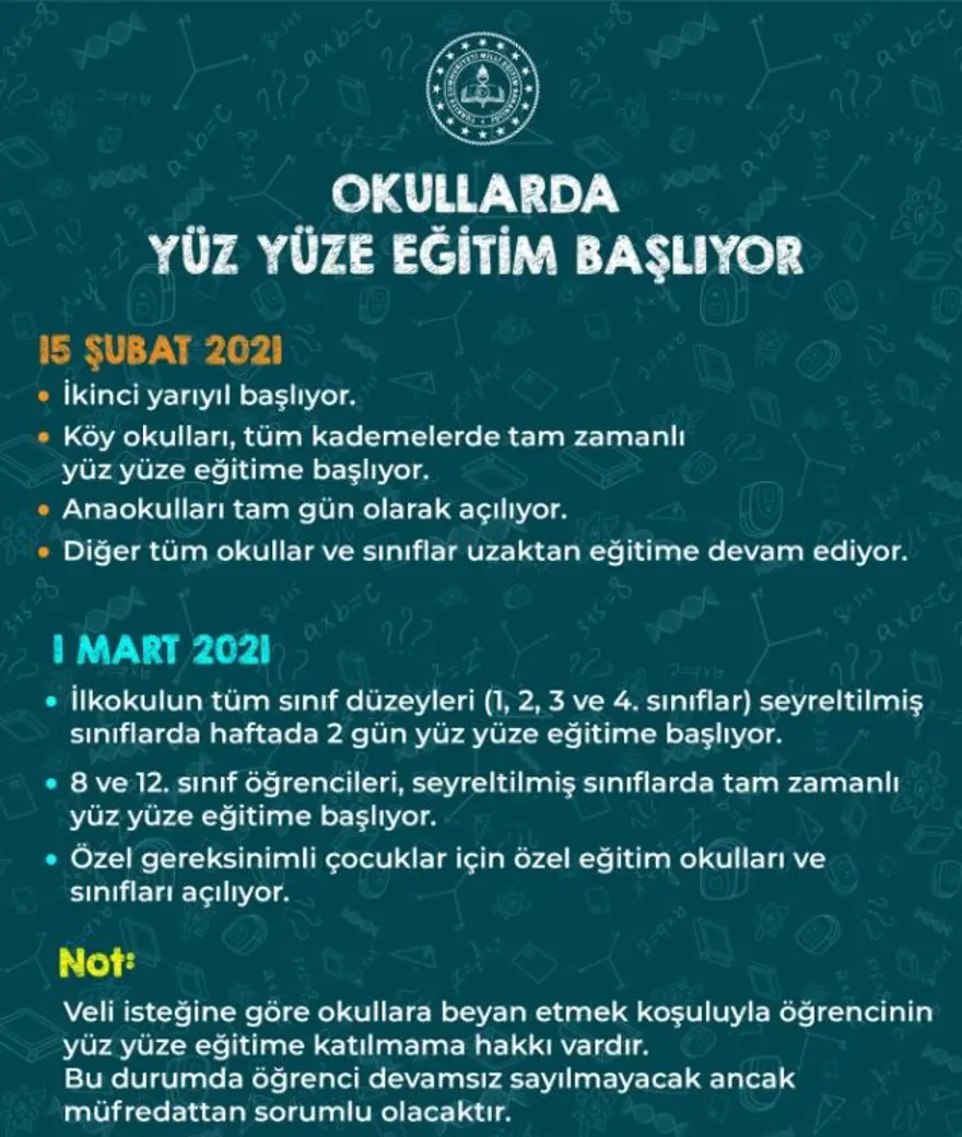 Yüz yüze eğitime katılmak yine velinin isteğine bağlı olacak.