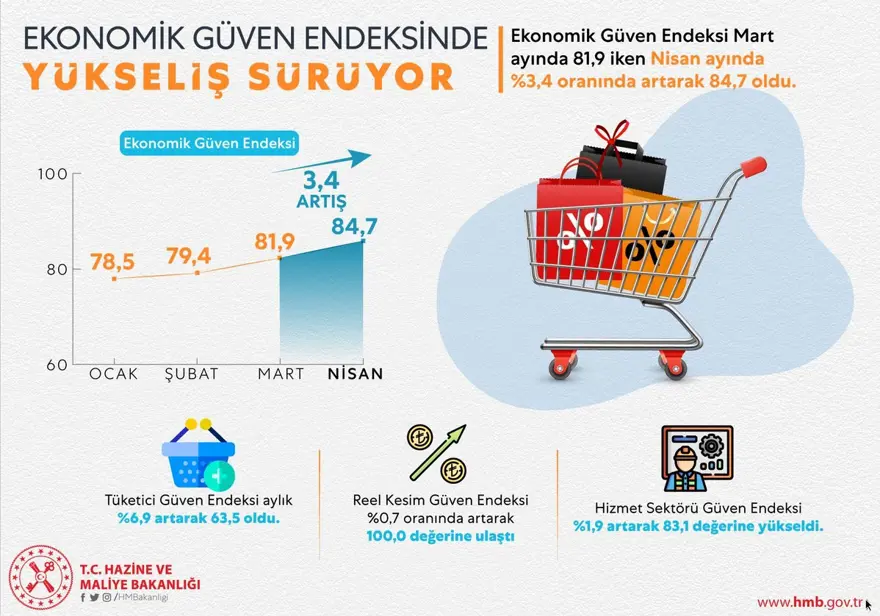 Ekonomik güven endeksi nisan ayında bir önceki aya göre yüzde 3.4 artışla 84.7 seviyesine yükseldi.