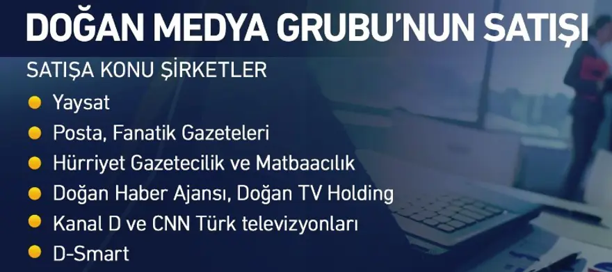 Doğan Grubu'nun medya varlıklarını Demirören Grubu satın alıyor. Resmi açıklama yapıldı. Anlaşmayla birlikte Aydın Doğan'a ait Hürriyet, Kanal D, Posta, Fanatik, CNN Türk, DHA, D-Smart gibi markalar Erdoğan Demirören'in sahibi olduğu Demirören Grubu'na geçecek.