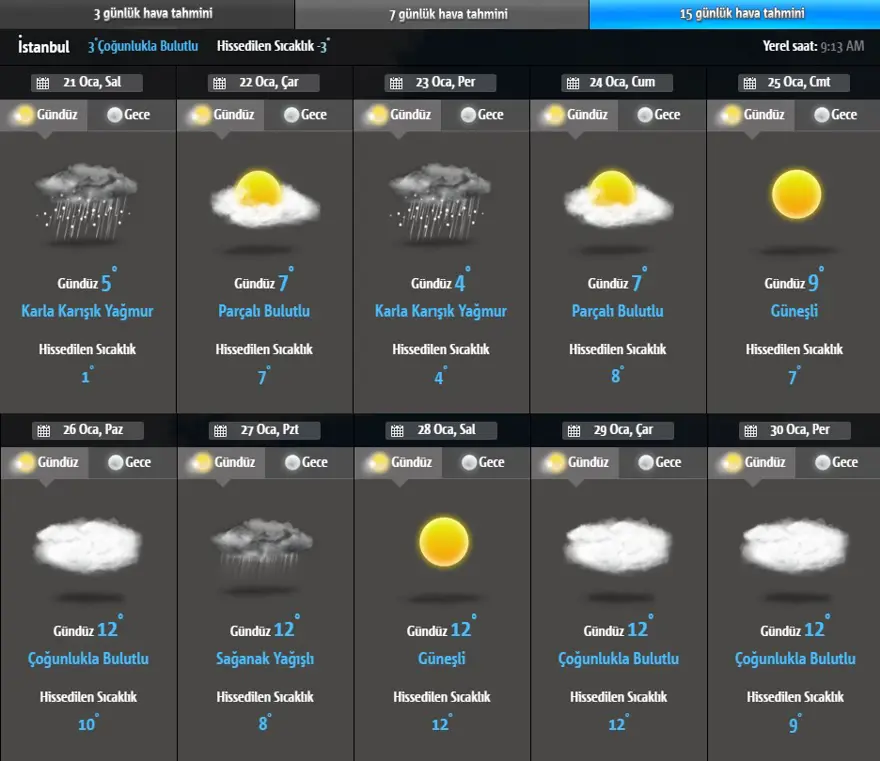 Hava durumu için Meteoroloji'den aktarılan son dakika haberine göre İstanbul'da dün etkili olan kuvvetli rüzgar bugün etkisini kaybedecek. Perşembe günü karayelin etkisi ile bölgede sıcaklıkların düşmesi ve beraberinde İstanbul'da kar ve karla karışık yağmur bekleniyor. Bugün Doğu Karadeniz'de şiddetli yağış beklenirken yurdun iç kesimlerinde buzlanma ve don olayları etkili olacak. Peki bugün hava nasıl olacak?