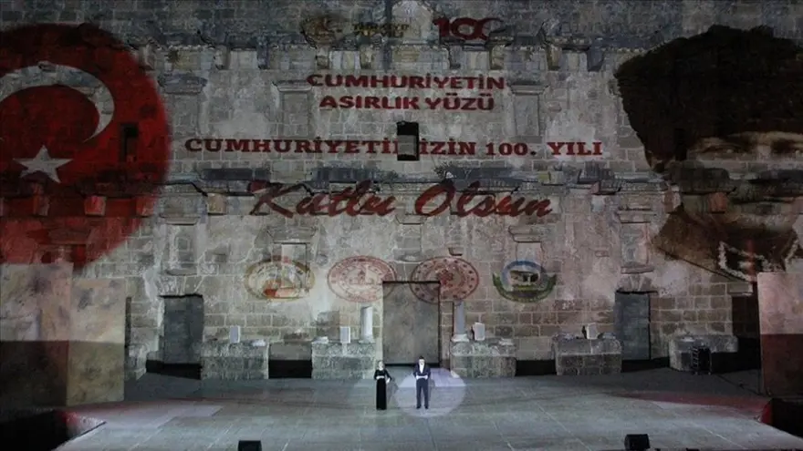 Antalya Valiliği ile İl Milli Eğitim Müdürlüğünce Aspendos Antik Tiyatrosu'nda düzenlenen "Cumhuriyet'in Asırlık Yüzü" gösterisi, Cumhuriyet'in ilanına atıfla saat 19.23'te başladı.