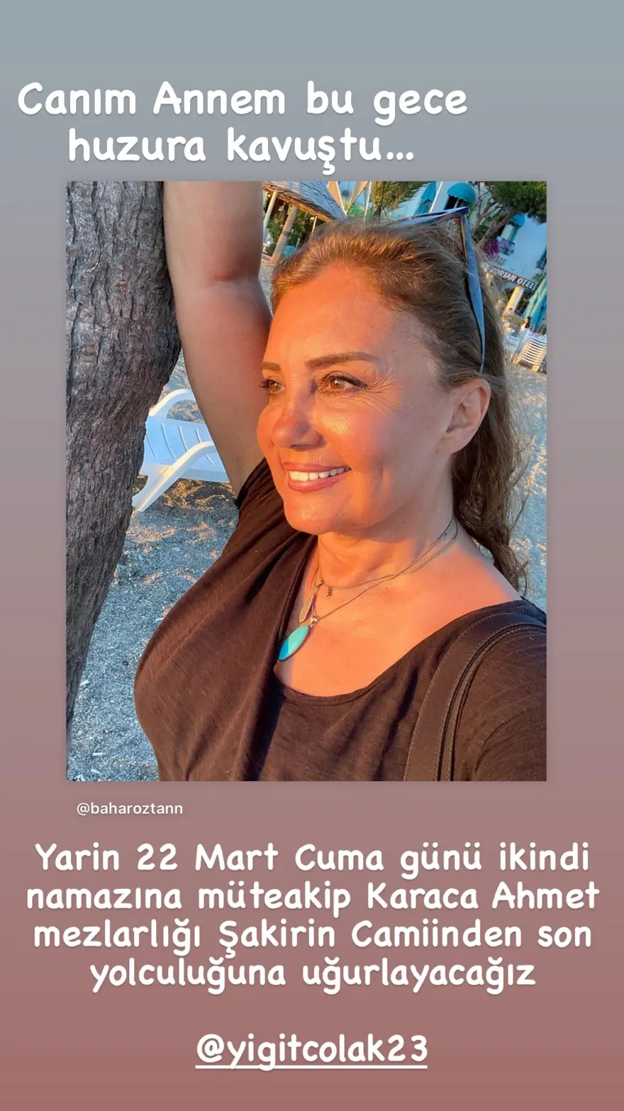 Öztan'ın oğlu Yiğit Çolak, annesinin sosyal medya hesabından yaptığı paylaşımda "Canım annem bu gece huzura kavuştu" ifadelerini kullandı.