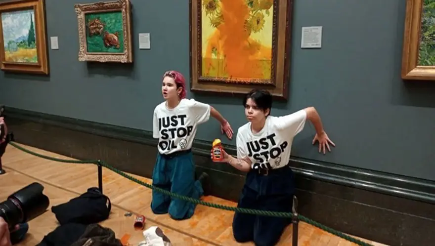 Çevreci grubun iki üyesi, başkent Londra'daki National Gallery'de sergilenen Vincent Van Gogh'un "Ayçiçekleri" tablosuna iklim değişikliğine dikkati çekmek amacıyla domates çorbası atmıştı.