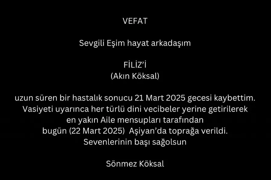 Filiz Akın'ın eşi Sönmez Köksal sosyal medya hesabından bir paylaşım yaparak Filiz Akın'ın 21 Mart'ta hayatını kaybettiğini ve bugün Aşiyan Mezarlığı'nda toprağa verildiğini açıkladı.