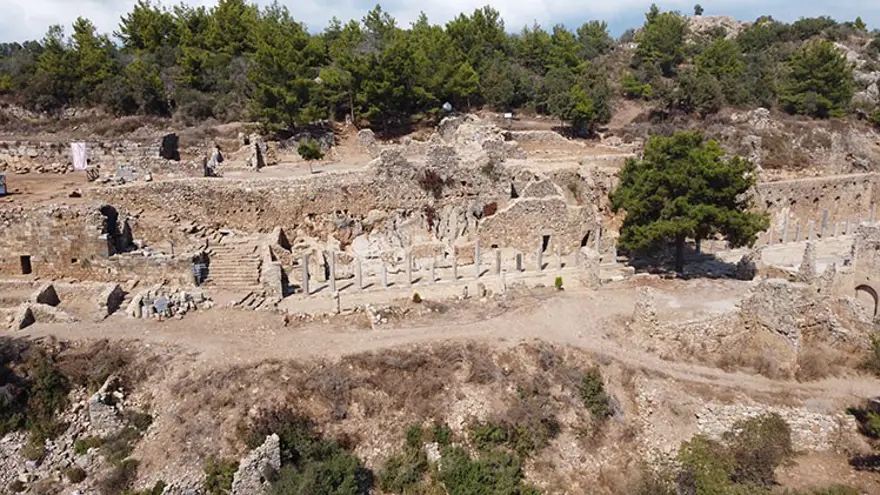 Antalya'nın Alanya ilçesindeki Syedra Antik Kenti'nde yürütülen çalışmada gün yüzüne çıkarılan yaklaşık 2 bin yıllık 46 sütun yerlerine dikildi.