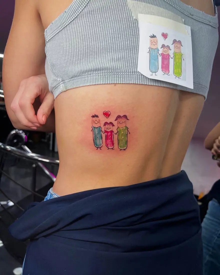 Nur adında bir çocukları olan ünlü çiftten Ceren Benderlioğlu, kızının 3 yıl önce çizdiği yara bandı figürlerini beline dövme yaptırdı.