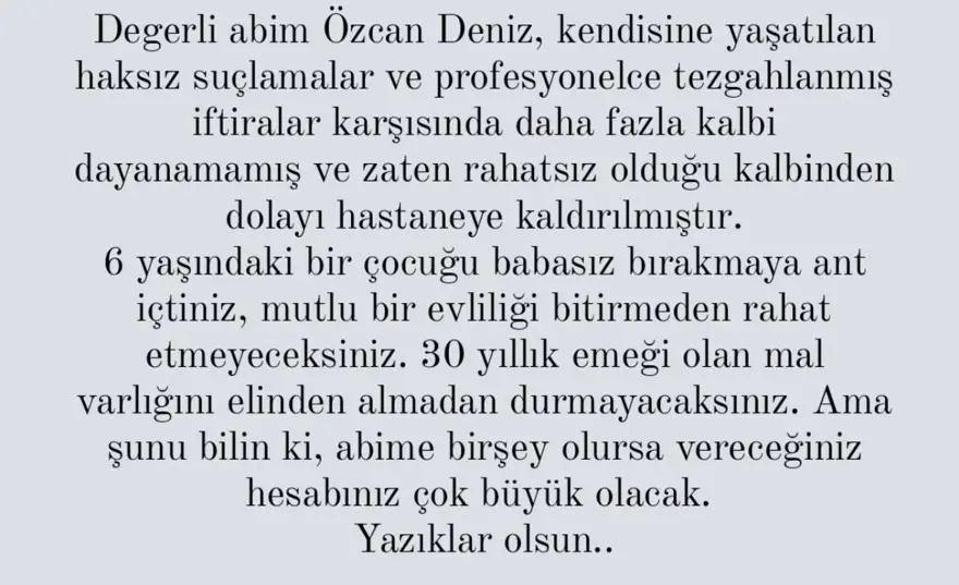 "Değerli ağabeyim Özcan Deniz, kendisine yaşatılan haksız suçlamalar ve profesyonelce tezgâhlanmış iftiralar karşısında daha fazla kalbi dayanamamış ve zaten rahatsız olduğu kalbinden dolayı hastaneye kaldırılmıştır. 6 yaşındaki bir çocuğu babasız bırakmaya ant içtiniz, mutlu bir evliliği bitirmeden rahat etmeyeceksiniz. 30 yıllık emeği olan mal varlığını elinden almadan durmayacaksınız. Ama şunu bilin ki, ağabeyime bir şey olursa vereceğiniz hesabınız çok büyük olacak. Yazıklar olsun..."