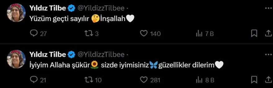 "Yıldız Tilbe, son durumunu sosyal medya hesabından açıkladı. 58 yaşındaki ünlü şarkıcı, "İyiyim, Allah'a şükür. Siz de iyi misiniz? Güzellikler dilerim. Yüzüm geçti sayılır, inşallah" ifadelerini kullandı.