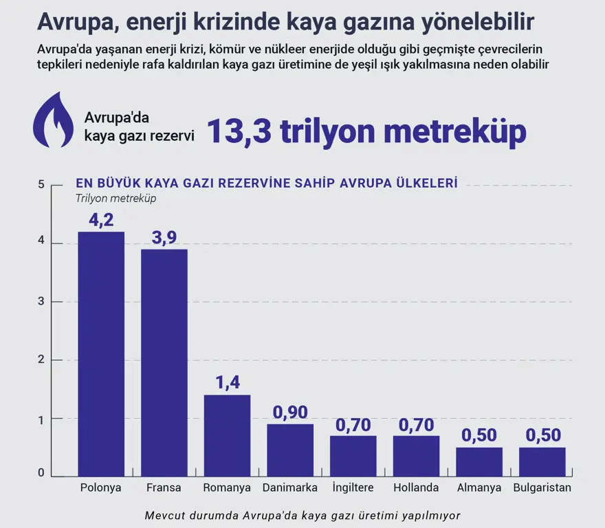 Avrupa'da yaşanan enerji krizi, kömür ve nükleer enerjide olduğu gibi geçmişte çevrecilerin tepkileri nedeniyle rafa kaldırılan kaya gazı üretimine de yeşil ışık yakılmasına neden olabilir. Avrupa'da yaklaşık 13,3 trilyon metreküp kaya gazı rezervi bulunuyor. En büyük rezerv Polonya'da.