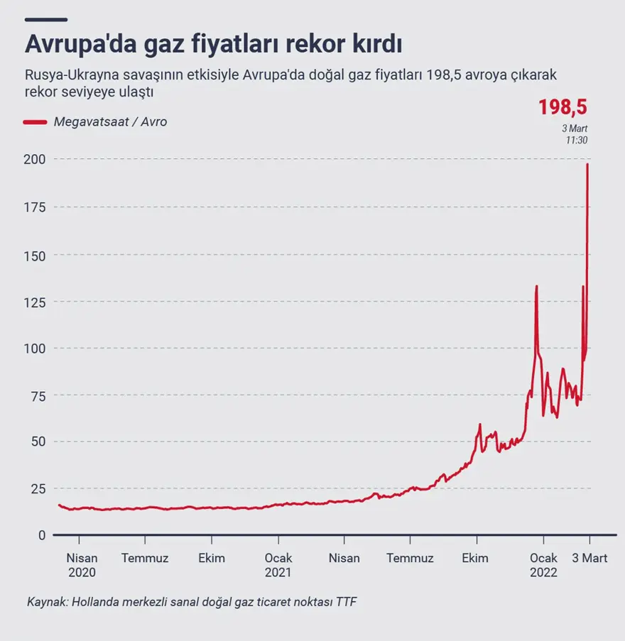 Rusya-Ukrayna Savaşı sonrasında Avrupa'da enerji arz güvenliğine yönelik endişeler artarken, doğalgaz fiyatları da megavatsaat başına 199 euroyla tüm zamanların en yüksek seviyesine ulaştı. Fiyatlar son bir yılda yaklaşık 10 kat artış gösterdi.