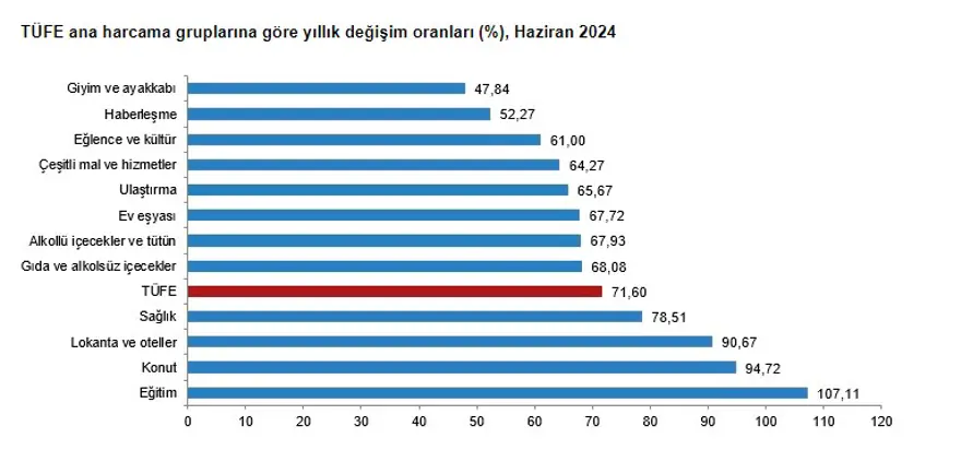 Haziranda geçen yılın aynı ayına göre en az artış gösteren ana grup, yüzde 47,84 ile giyim ve ayakkabı oldu. Buna karşılık, geçen yılın aynı ayına göre artışın en yüksek olduğu ana grup ise yüzde 107,11 ile eğitim olarak belirlendi.