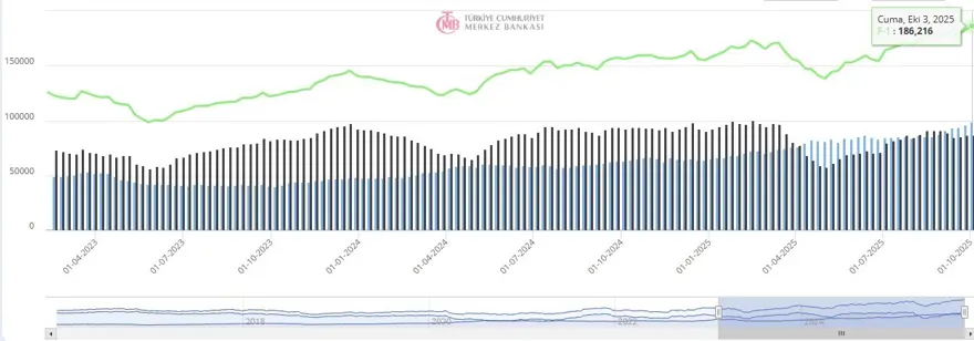 Döviz rezervleri 86 milyar 699 milyon dolardan 87 milyar 27 milyon dolara yükseldi.
