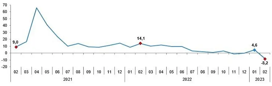 Sanayi üretimi şubatta bir önceki yılın aynı ayına göre yüzde 8,2 azaldı. Önceki aya göre düşüş yüzde 6 oldu.