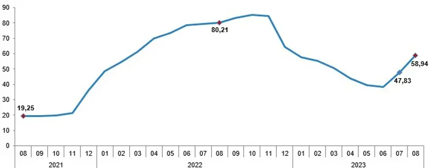 TÜİK verilerine göre, ağustosta TÜFE yüzde 9,09'la beklentilerin üzerinde artış kaydetti. Yıllık bazda TÜFE yüzde 58,94'e yükseldi.