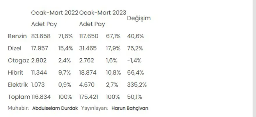2022 ve 2023'ün ocak-mart dönemlerinde motor tipine göre otomobil satış adetleri, payları ve değişimleri şöyle;