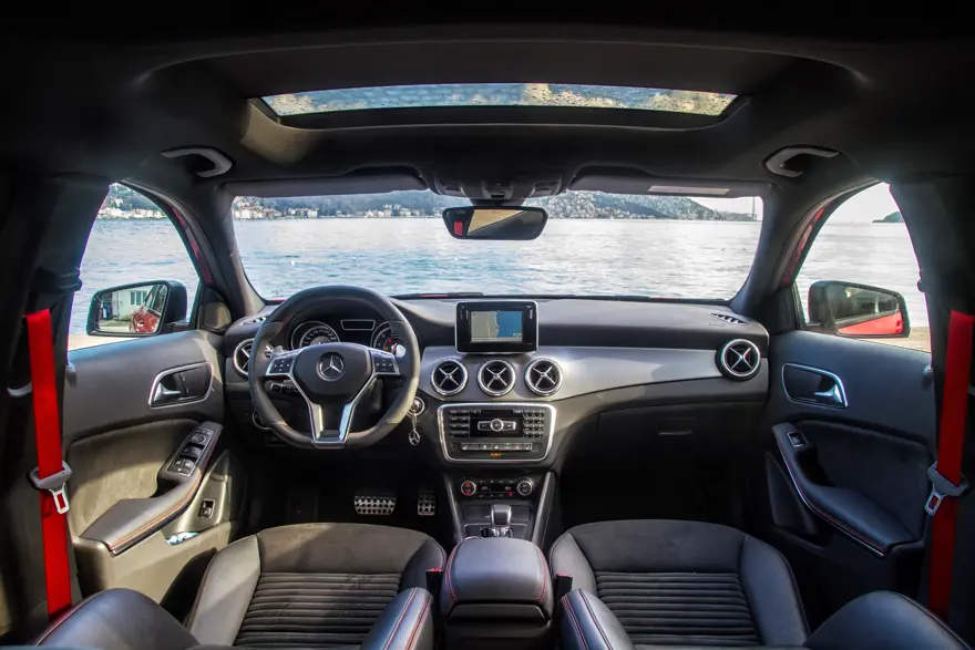 İç mekanda sürücüyü cezbeden en önemli nokta oturduğunuz anda farkını ortaya koyan, vücudu saran ve sert virajlarda dahi neredeyse kıpırdamanıza izin vermeyen spor koltuklar oluyor. Fakat ısıtmalı olmasına rağmen koltuk ayarlarının elektronik olarak değil, manuel olarak yapılması bazı sürücülerin hoşuna gitmeyebilir. Bir AMG aracının içinde olduğunuzu hissettiren kokpitte Deri-Mikrofiber karışımlı AMG performans spor direksiyon simidi, kırmızı emniyet kemerleri ve yine kırmızı renk dikişler hemen dikkat çekiyor.