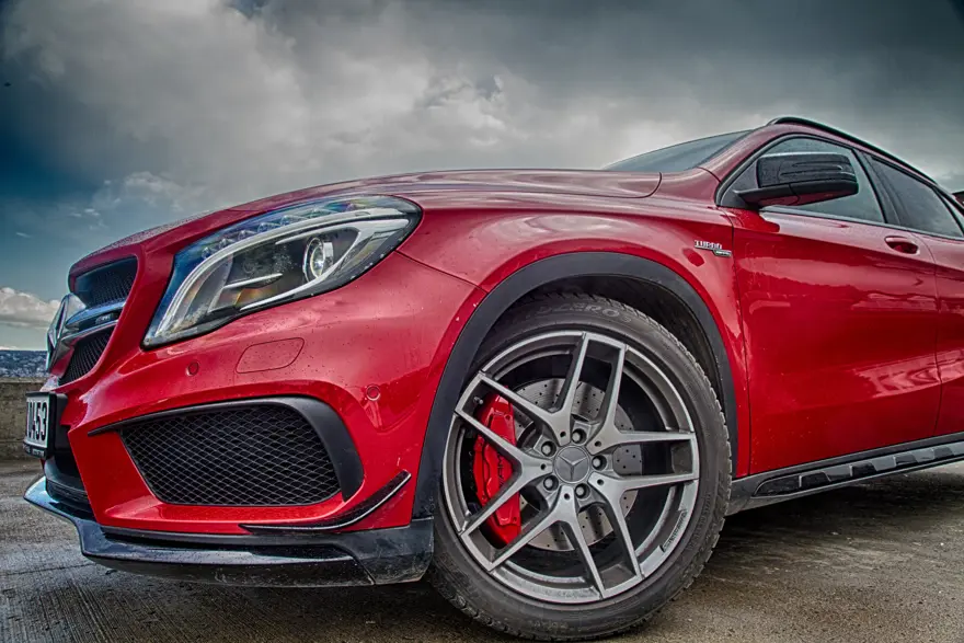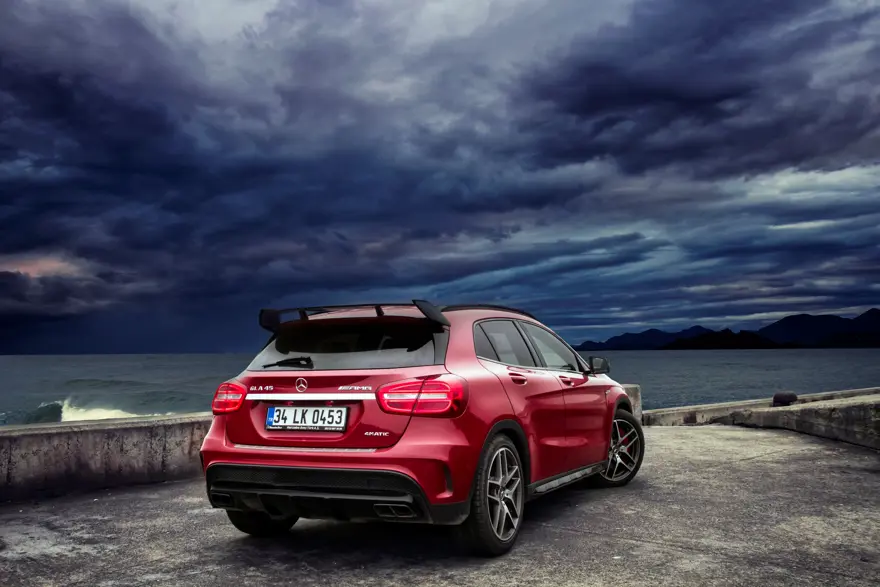 GLA 45 AMG Jüpiter Kırmızısı olarak adlandırılan rengi ve sıra dışı tasarımıyla meraklı bakışları üzerinde topluyor. İlk bakışta standart GLA’dan ön ve arka tamponlar, büyük ön ızgara, 19 inç beş çift kollu AMG jantlar, kırmızı fren kaliperleri, parlak siyah alüminyum tavan rayları ve AMG arka rüzgarlık gibi detaylarla ayrılan araç kaslı görüntüsüyle her noktasında performans vurgusu yapıyor.