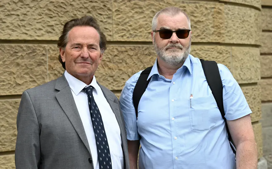 Covid-19 aşısının yan etkileri olduğu iddiasıyla tazminat talep eden Dietmar Scherer'in (sağda) avukatı Joachim Ceasar-Preller (solda)