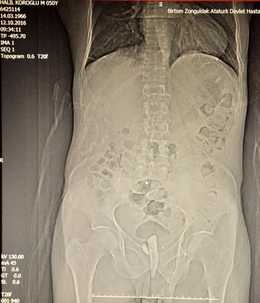 İdrar yapma zorluğu ile hastaneye giden Halil Köroğlu, doktorları bile şaşırttı. Köroğlu'nun tetkiklerinde idrar kanalı ve idrar kesesinde 8 santim uzunluğunda bir odun parçası saptandı.