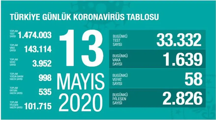 Sağlık Bakanı Fahrettin Koca, Türkiye'de corona virüs salgınına ilişkin son verileri açıkladı. Buna göre, can kaybı 58 artarak 3 bin 952'ye yükselirken, son 24 saatte bin 639 yeni vaka tespit edildi; 2 bin 826 kişi iyileşti. Covid-19 nedeniyle yoğun bakımda kalan hasta sayısı da ilk kez binin altına geriledi.