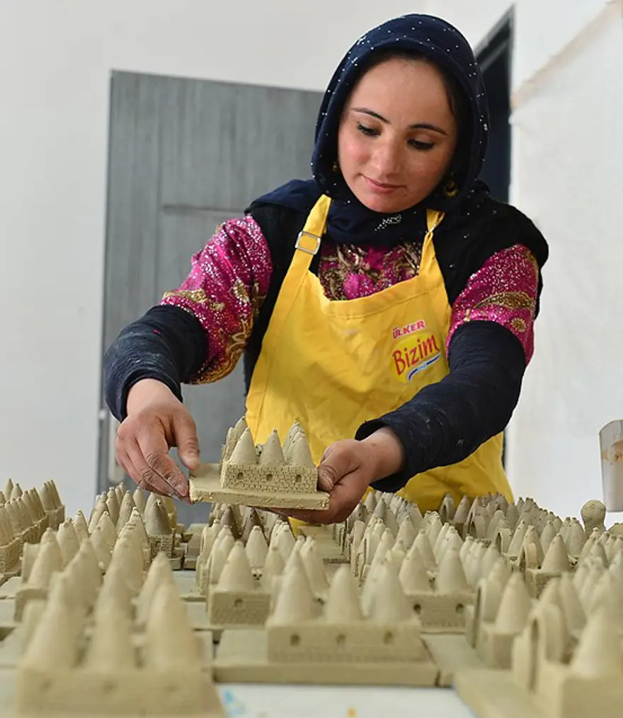 Şanlıurfa'nın Harran ilçesinde Türk ve Suriyeli kadınlar tarafından tarihi konik kubbeli Harran evlerinin seramikten biblosu üretilmeye başlandı.