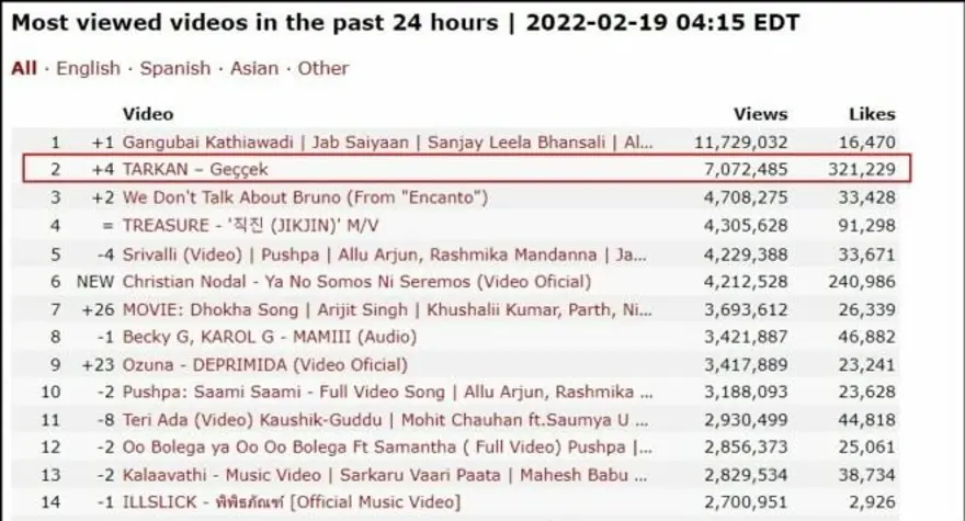 Kworb verilerine göre de, klip 24 saat içinde YouTube’da 7 milyondan fazla görüntülenmeyle dünyada en çok izlenenler listesinde 2. sırada yer aldı.