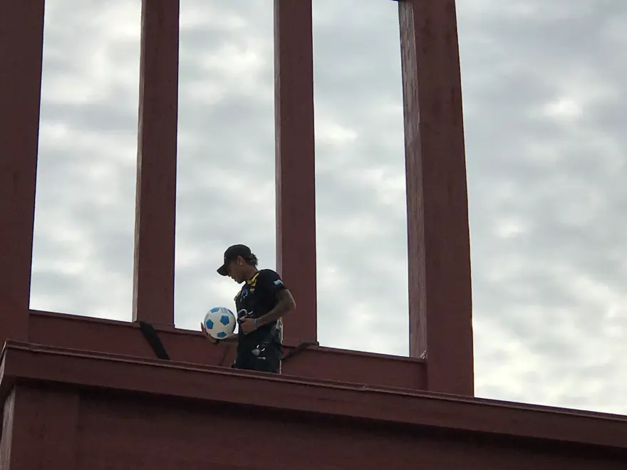 Ailesiyle Cenevre'ye gelen Neymar, basın toplantısı öncesinde BM Cenevre Ofisi önündeki sivillere yönelik silahlı şiddete karşı mücadeleyi simgeleyen "kırık sandalye heykeli"ne vinç yardımıyla çıkarak top sektirdi.