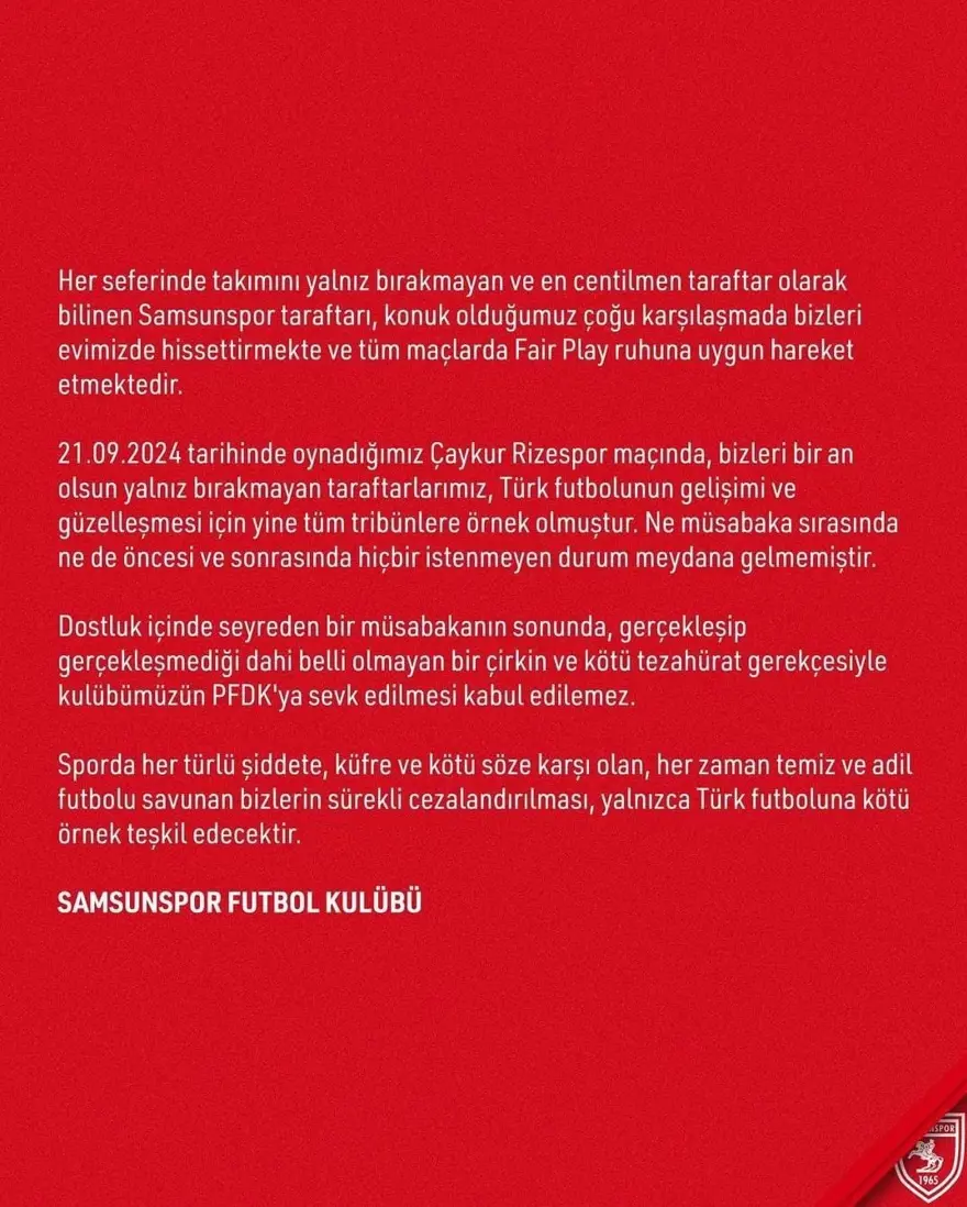 Alınan karar ile sosyal medya hesaplarından açıklamada bulunan Samsunspor, “Her seferinde takımını yalnız bırakmayan ve en centilmen taraftar olarak bilinen Samsunspor taraftarı, konuk olduğumuz çoğu karşılaşmada bizleri evimizde hissettirmekte ve tüm maçlarda Fair Play ruhuna uygun hareket etmektedir. 21.09.2024 tarihinde oynadığımız Çaykur Rizespor maçında, bizleri bir an olsun yalnız bırakmayan taraftarlarımız, Türk futbolunun gelişimi ve güzelleşmesi için yine tüm tribünlere örnek olmuştur. Ne müsabaka sırasında ne de öncesi ve sonrasında hiçbir istenmeyen durum meydana gelmemiştir. Dostluk içinde seyreden bir müsabakanın sonunda, gerçekleşip gerçekleşmediği dahi belli olmayan bir çirkin ve kötü tezahürat gerekçesiyle kulübümüzün PFDK'ya sevk edilmesi kabul edilemez. Sporda her türlü şiddete, küfre ve kötü söze karşı olan, her zaman temiz ve adil futbolu savunan bizlerin sürekli cezalandırılması, yalnızca Türk futboluna kötü örnek teşkil edecektir” ifadelerine yer verdi.