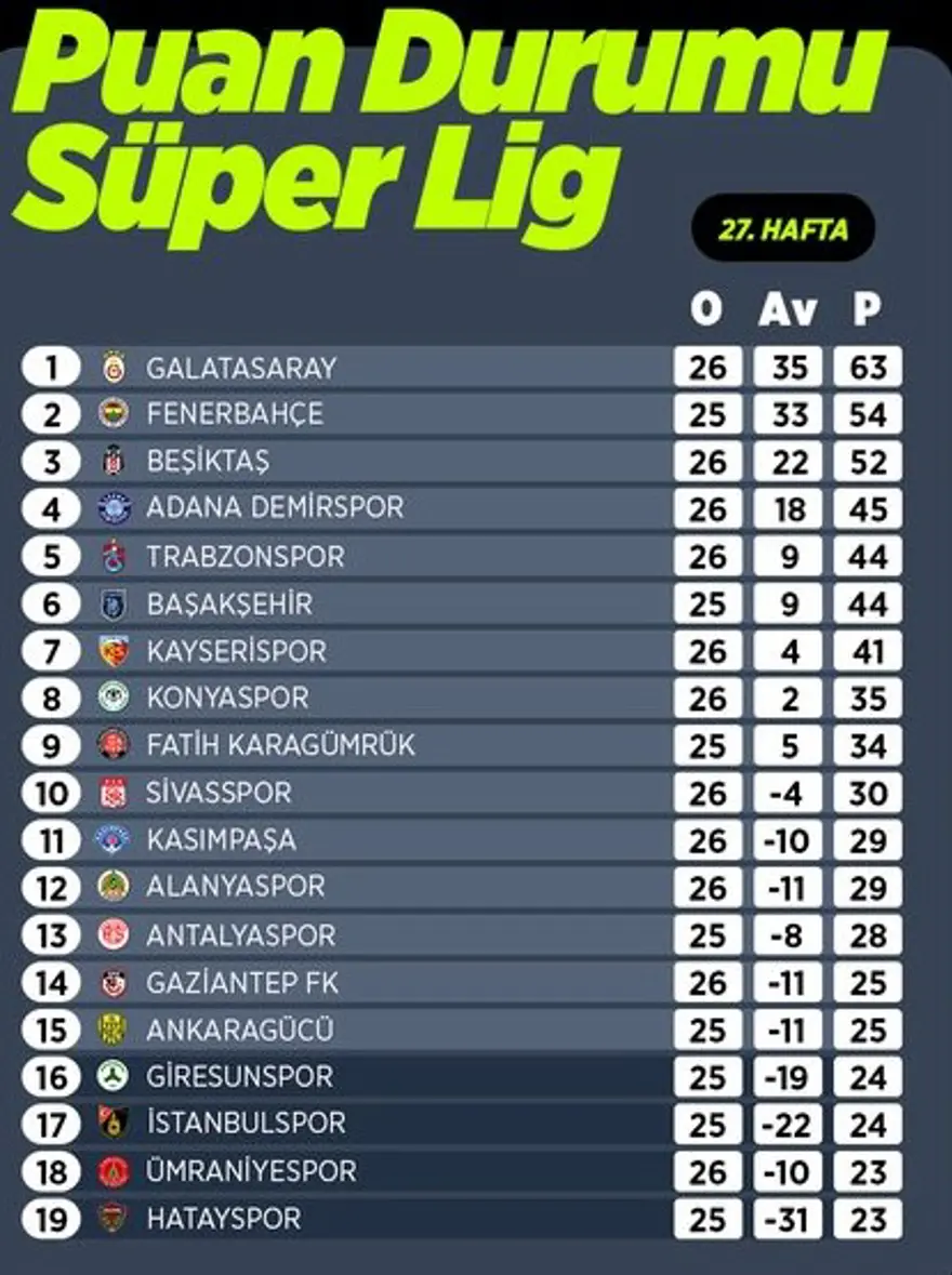 Ligde sona eren 27. haftanın ardından oluşan puan durumu şöyle: