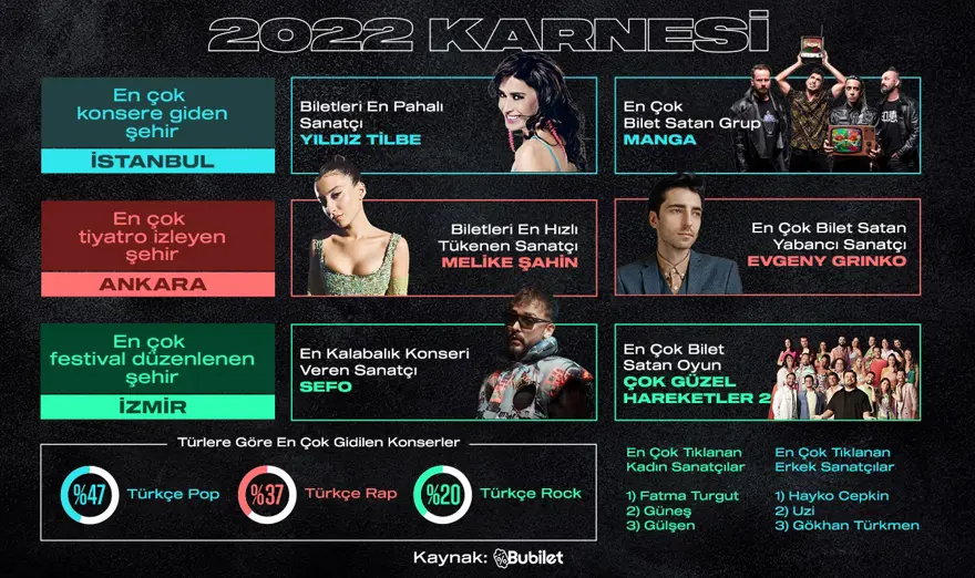 Rap sanatçısı Sefo başarısını 2022’deki en kalabalık konsere ev sahipliği yaparak taçlandırdı. Biletleri en hızlı tükenen sanatçı Melike Şahin ‘diva bebe’ olarak anılmaya başlandı. Bileti en çok satın alınan müzik grubu Manga iken, Evgeny Grinko yılın en çok bilet satan yabancı ismi olarak kayıtlara geçti. Yıldız Tilbe ise en pahalı konser biletleriyle yıla damgasını vurdu.