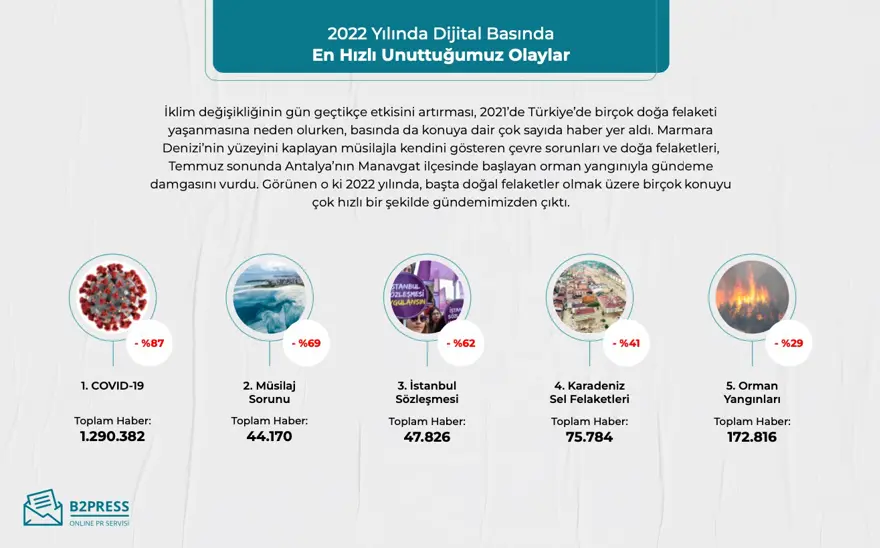 Online Basın Bülteni ve PR Servisi B2Press tarafından aynı kapsamda 2021’de hazırlanan raporun en çok konuşulan konular listesinde ilk üçte 10.424.489 haberle COVID-19, 643.293 haberle Türk Lirası’nın Değer Kaybı ve 316.256 haberle Merkez Bankası’ndaki başkan değişikleri yer almıştı.
