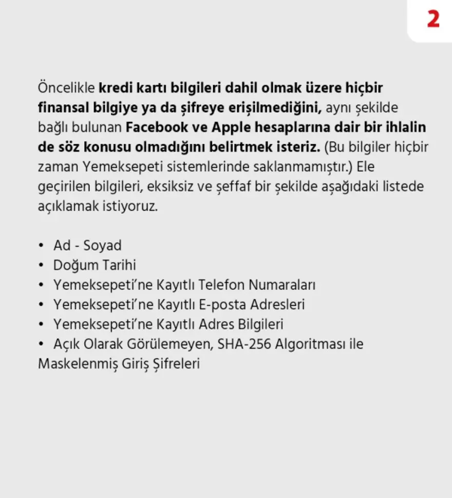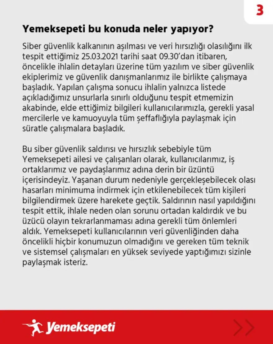 Haberi Görüntüle Yemeksepeti'nin Twitter hesabından yapılan açıklamaya göre 25 Mart tarihinde korsanlar tarafından siteye siber saldırı düzenlendi ve kullanıcıların bazı bilgileri çalındı. Kredi kartı bilgilerinin güvende olduğunu aktaran şirket ele geçirilen bilgileri şu şekilde açıkladı: