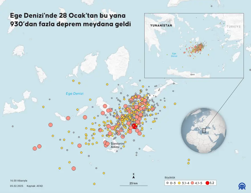 Raporda, Ege'de, Santorini Adası ve civarında meydana gelen ve 28 Ocak'tan itibaren yoğunlaşmaya başlayan depremlerin sayısının bugün itibarıyla 900'ün üzerine çıktığı dile getirildi.
