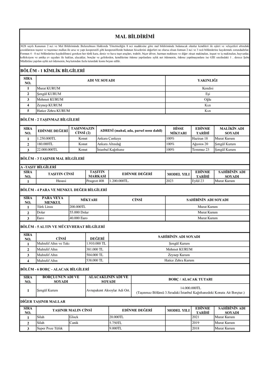 Mal bildiriminde Murat Kurum’un Ankara Çankaya’da 1 milyon 250 bin liraya alınmış bir evi, eşi Şengül Kurum’un annesi ve babası için Ankara Altındağ’da 180 bin liraya aldığı bir ev, Şengül Kurum adına İstanbul Kağıthane’de 22 milyon liraya satın alınmış bir evle, 1 milyon 200 bin liraya alınmış 2023 model bir otomobilleri olduğu yer alıyor.