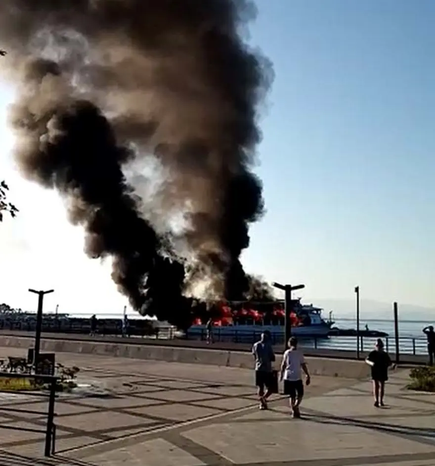 Balıkesir Edremit'te tur teknesi alev alev yandı