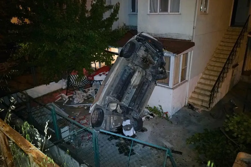 Bahçeye düşerek ters dönen otomobilin sürücüsü Taner Y. ile minibüsteki Nazmi G. ve Tevhide A. yaralandı.