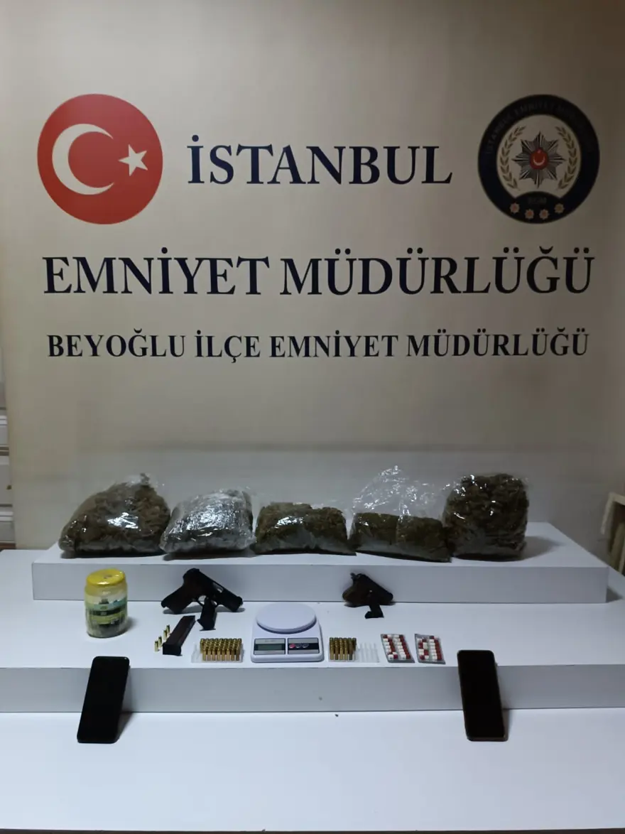 Beyoğlu'nda bir eve düzenlenen polis baskınında 6 parça halinde toplam 2 kilo 697 uyuşturucu madde, 27 adet sentetik hap, 2 ruhsatsız tabanca ve tabancalara ait farklı çaplarda 72 fişek ele geçirildi. Gözaltına alınan şüpheli ise polise verdiği ifadede “Diş ağrısına iyi geliyor dediler önerdiler aldım." dedi.
