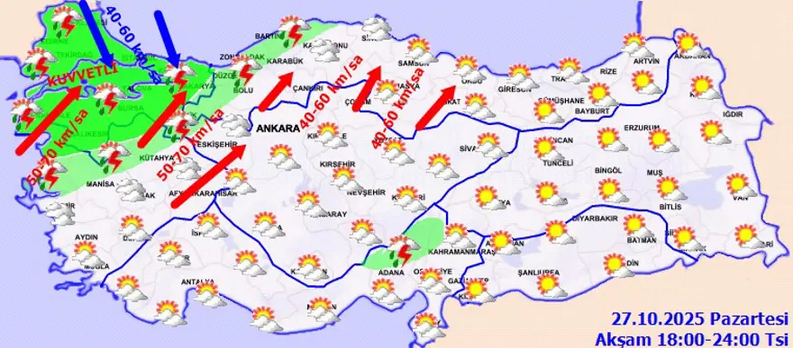 Marmara, Kuzey ve Kıyı Ege, Batı Karadeniz, Eskişehir çevreleri, Ankara ve Çankırı'nın batı ilçeleri, İskenderun Körfezi ve Doğu Akdeniz'de gök gürültülü sağanak görülecek. Yağışlar, öğleden sonra ve akşam Marmara'da, gece saatlerinde ise İzmir ve Manisa çevrelerinde kuvvetli olacak.
